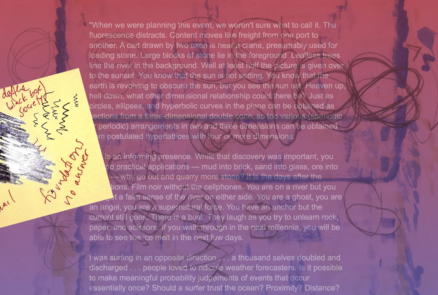 **VS**: I was thinking about election cycles, and the speed at which things are normalized or subsumed within US electoral politics, and the immense but controlled space-time that it all takes up. Something happens, things fall apart, we have to focus on fixing what happened, and soon enough we’re recalibrating towards the next cycle. That’s the type of recalibration that I feel like I’m used to, but going back to your first question, you’re gesturing towards a co-opting of the word “recalibration.” What you’re talking about is a very interesting, agentic, resistance-style recalibration. Our word for that is “nonstop.” It’s a spirit, or an intensity of desire that could never be explained. We fandomly encountered it via the actions of a group of people in Ohio who fought to preserve Antioch College around 2008, and it’s become such an important part of our vocabulary.